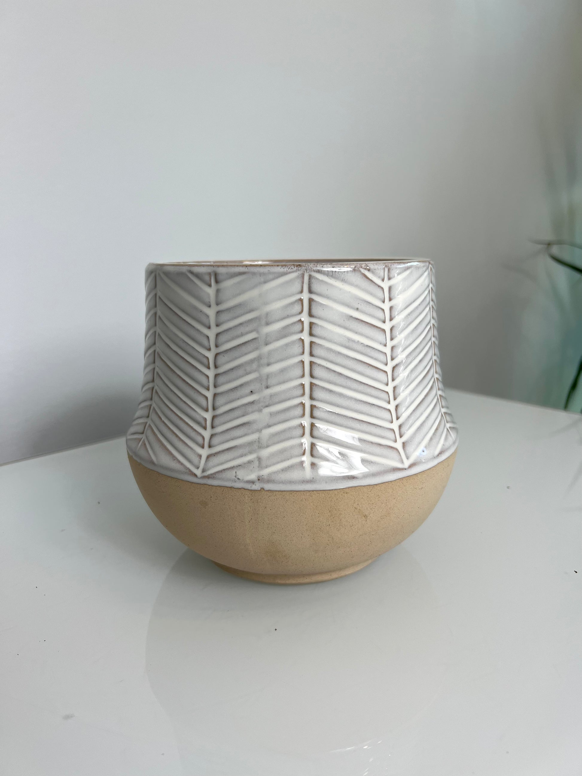 These beautiful beige planters are a must have! They are beautifully designed to have a sandy gravel bottom with textured groves on the top. The small one has rough vertical lines, while the large one has groves that resemble a leaf.