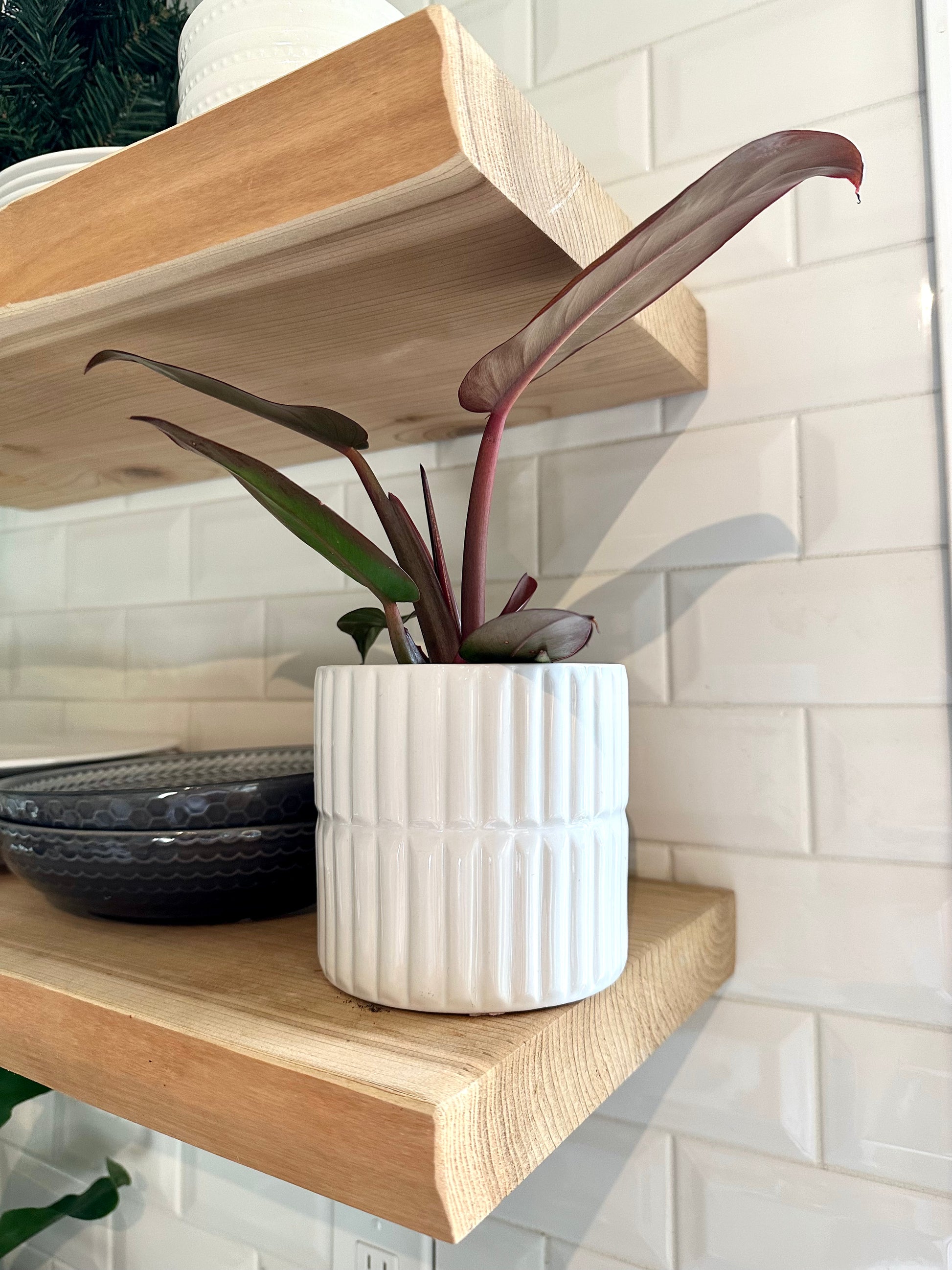 These contemporary planters have a glossy surface with a ribbed design and a bright white exterior.