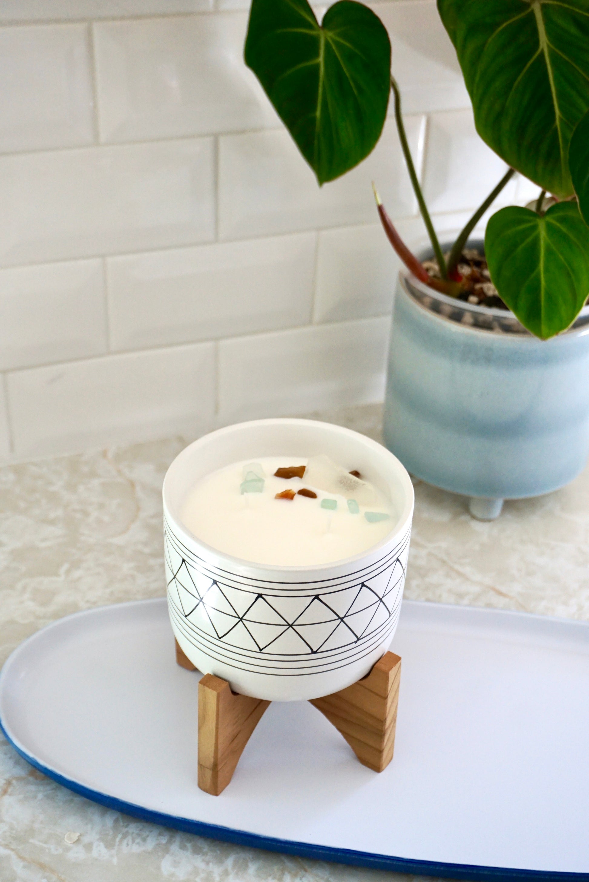 Our "Pacific" melted pot is a 20 oz, 2 wick soy candle inside of a 4 inch ceramic plant pot, on a wooden stand, topped with sea glass from the beaches of the Pacific ocean.
