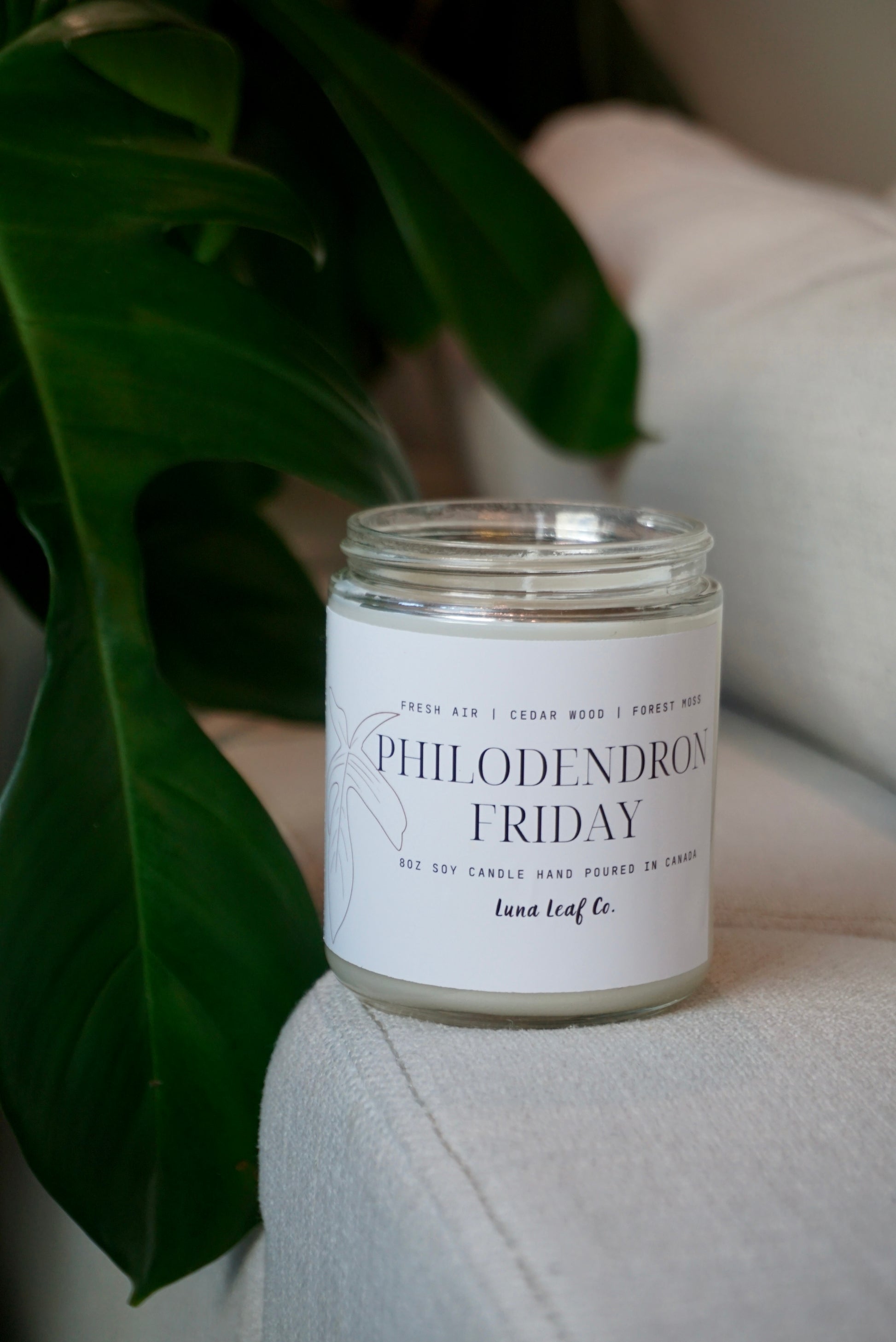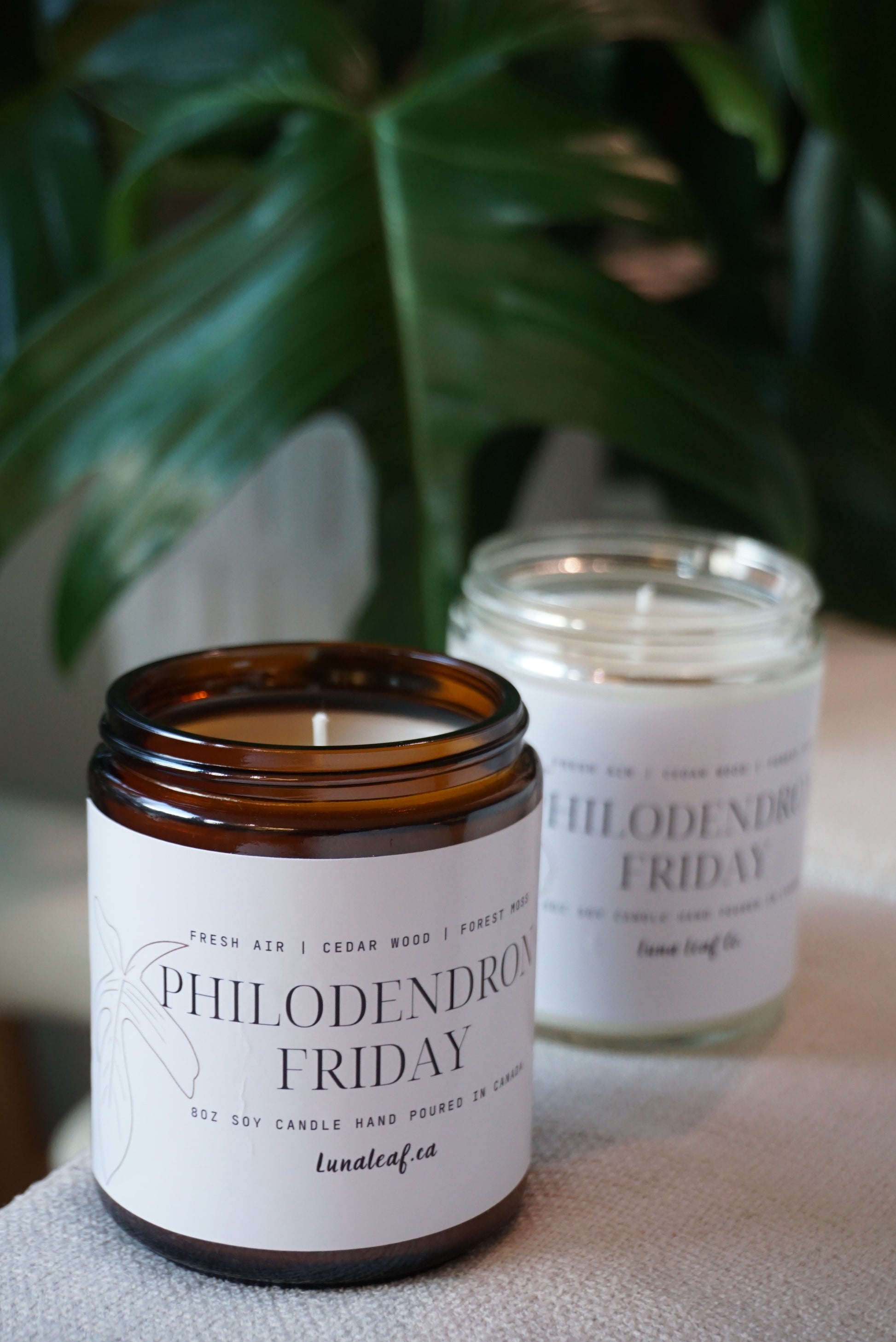 The 'Philodendron Friday' soy candle is our interpretation of the philodendron genus. A crisp fragrance that captures the freshness of cool air and rain forest moss. This captivating aroma cleans the air and leaves you feeling refreshed!