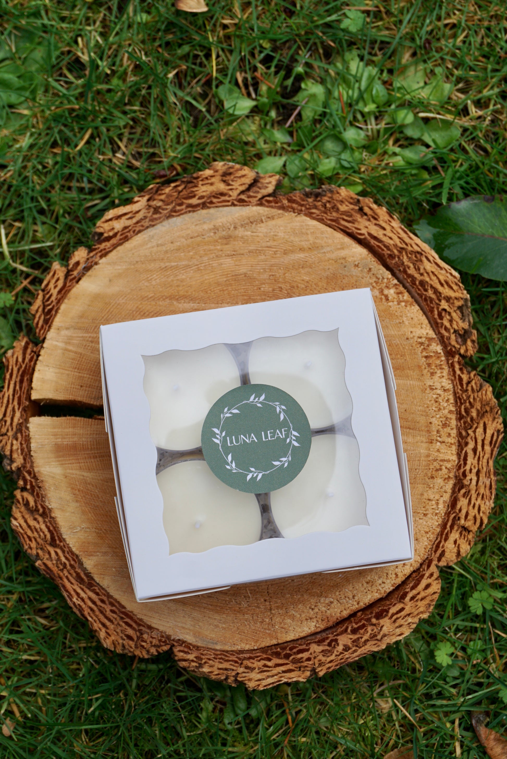 Our tea lights are 1.5 oz, 3x the size of regular tea lights. All four tea lights are packaged together in a white box, perfect for gifting!